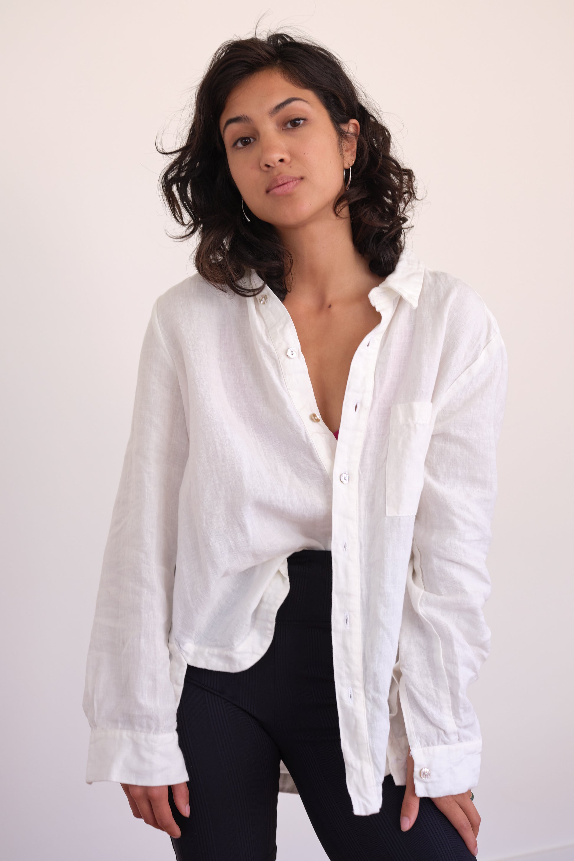 Unisex, perfectly oversized button down shirt. It features a single front pocket and rounded split hem that hangs longer in back. Fits true to men’s sizing, it is designed with an oversized fit in mind.