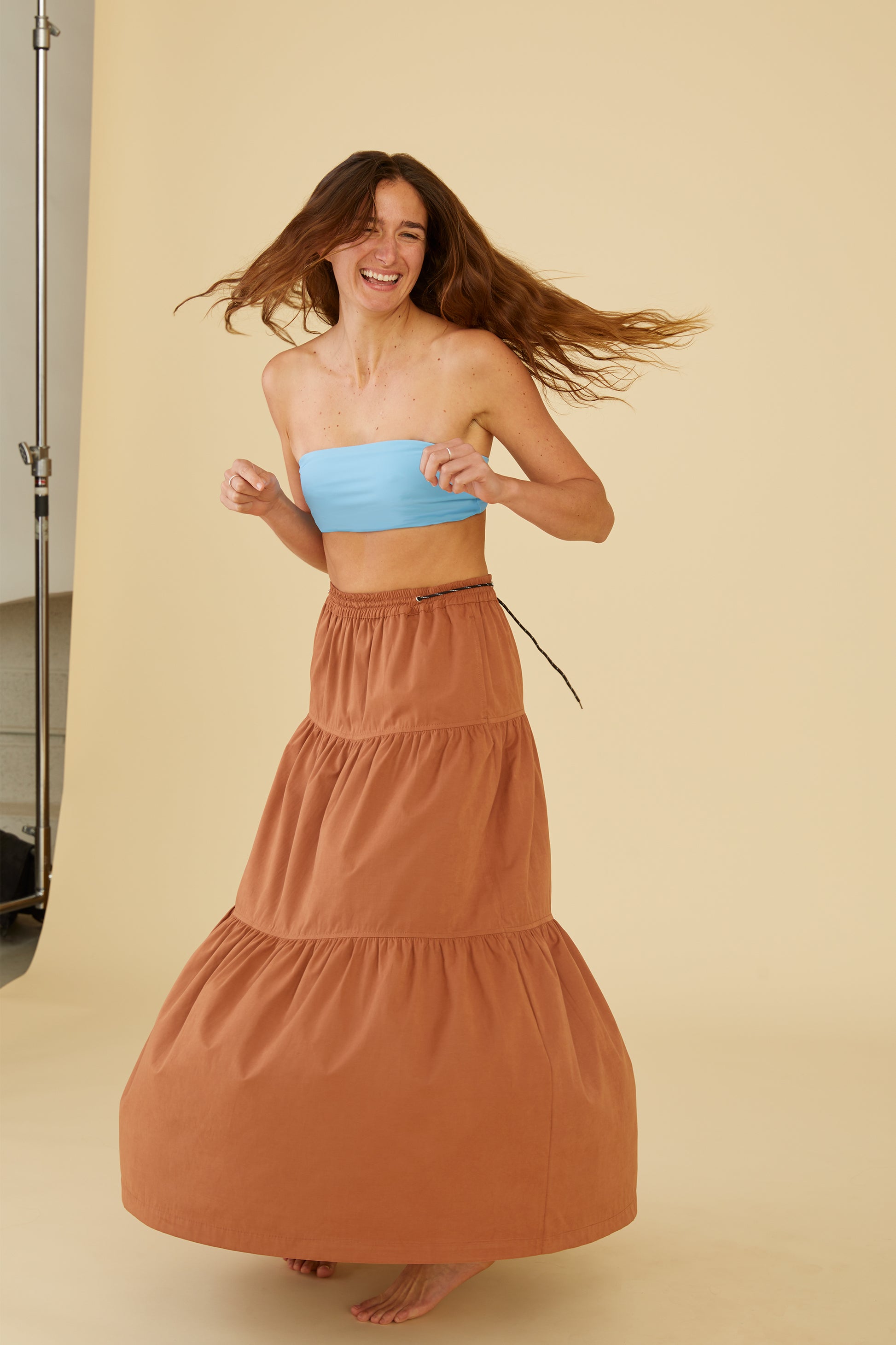 Bandeau top with 5/8" wide removable straps and shirred elastic back detail.